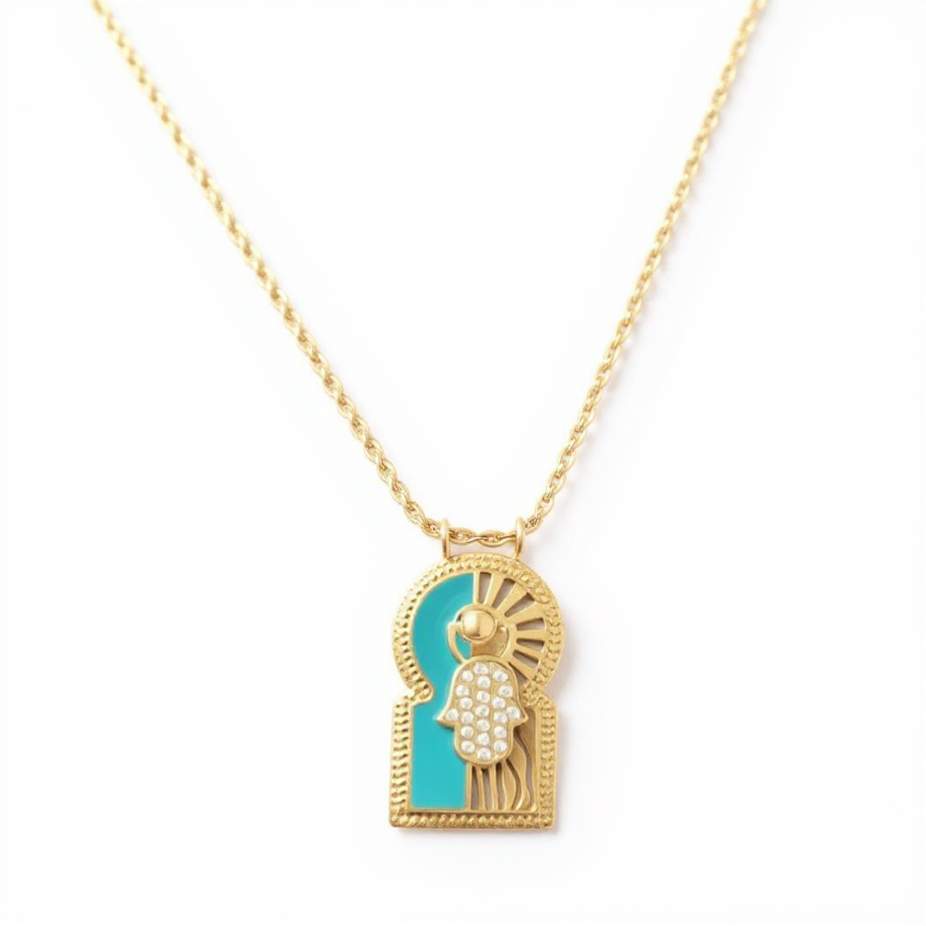 Sautoir Bab Mansour doré émaillé, inspiré de l’art marocain. En acier inoxydable, élégant, symbolique et résistant à l’eau.
