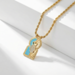 Inspiré de l’iconique Bab Mansour, joyau architectural marocain, ce sautoir incarne l’élégance, l’héritage et le raffinement. Son pendentif finement travaillé associe une finition dorée luxueuse, un émail turquoise lumineux et des détails décoratifs délicats qui rappellent l’art et la richesse culturelle du Maroc.